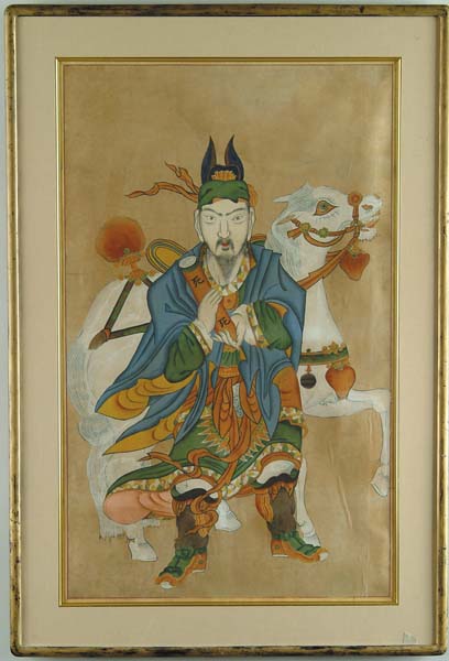 UNSIGNED (Japanese, 19th Century) WARRIOR AND HIS HORSE. Watercolor shows warrior holding scroll in front of white horse. Colorful costume and horse trappings. Housed in a gilt frame with linen liner and gold edge. SIGHT SIZE: 29-1/2” x 18-1/4”. CONDITION: Very good. 9-95424 (300-500)