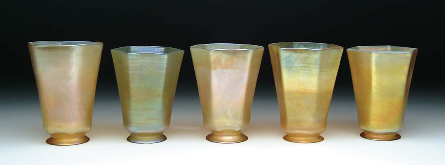 FIVE TIFFANY GOLD FAVRILE SHADES. Set of five Tiffany shades are done in a slightly flaring hexagonal design with gold iridescent finish. Each shade is signed on the fitter rim “LCT”. SIZE: Range from 5 in. to 5-3/8 in. t x 2-1/4 in. fitters. CONDITION: Some minor chips to fitter rims, otherwise very good to excellent. 5-60998 (3,000-4,000)