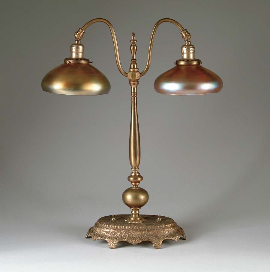 STEUBEN DOUBLE BANKER’S LAMP. Very nice double Banker’s lamp has gilt metal foot with reposse design with plain brass finish riser supporting double arms. The lamp is mounted with two Steuben gold aurene shades. Each shade is signed with Fleur de Lis mark. The lamp has double switches on the foot. SIZE: Shades are 6-1/2” dia. Overall height 22”. CONDITION: Some minor discoloration to finish on base, otherwise very good to excellent. 5-71392 (600-1,000)