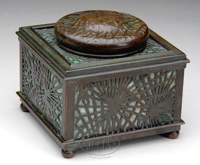 TIFFANY STUDIOS “PINE NEEDLE” INKWELL. Lovely Tiffany inkwell has pine needle openwork design against a green slag glass background. Hinged lid lifts to reveal the original glass insert. Bronze metal is finished in a rich brown patina with green highlights. Signed on underside “Tiffany Studios New York 844”. SIZE: 4″ sq. CONDITION: Glass insert has some chips to edge, most of green highlights on lid are worn and hinge has some play. 5-66611 (900-1,200)