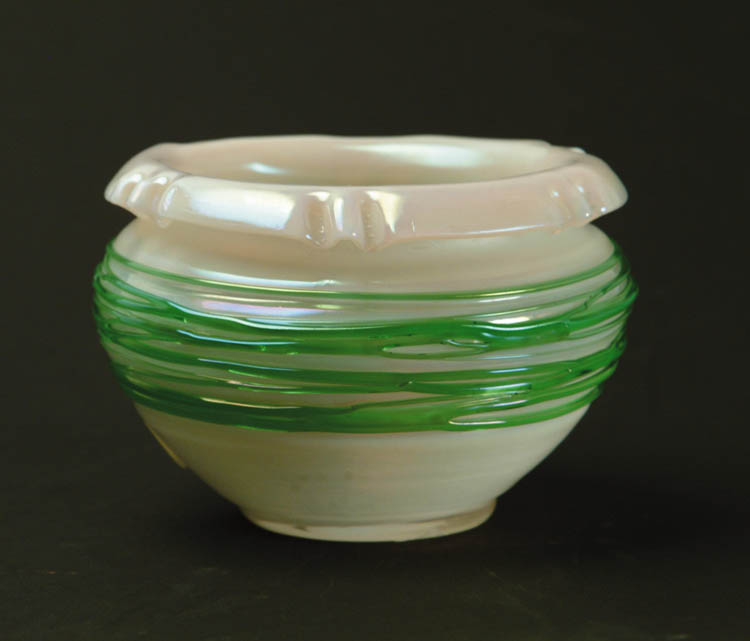 LOETZ TYPE IRIDESCENT BOWL. Applied green threading over white iridescent glass with a fold-down and ruffled top. SIZE: 5″ diameter. CONDITION: Very good to excellent. 5-67581 (200-300)