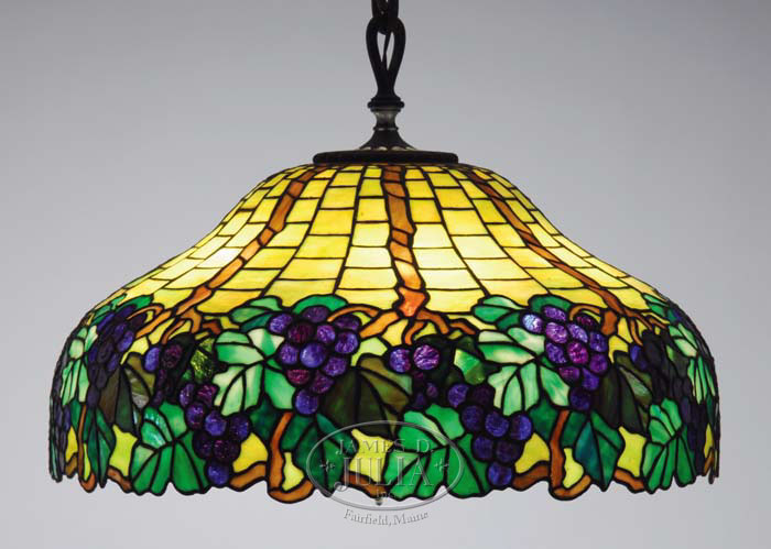 DUFFNER & KIMBERLY MOSAIC GRAPE CHANDELIER Outstanding Duffner & Kimberly chandelier has uneven border with clusters of purple and blue grapes surrounded by green grape leaves. Leaves and clusters are suspended from brown stems descending from the top of the shade. Design is set against an amber-yellow geometric background. Shade is topped with original Duffner & Kimberly heat cap and a short length of original chain. Chandelier is illuminated by its original six socket cluster. SIZE: 22″ dia. CONDITION: Glass is very good to excellent with very few, if any tight hairlines. Two replaced sockets, cluster is missing its bottom cap. Only pull chains remain. 5-65399 (12,000-15,000)