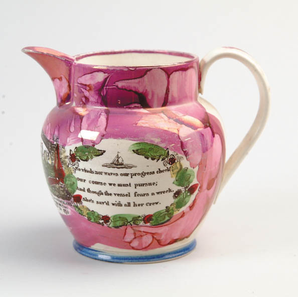 SUNDERLAND PINK LUSTRE JUG. Decorated with three vignettes. 1) “The Rich Widow” shows woman with wreath. 2) Cast Iron Bridge Near Sunderland”. 3) Four line verse. SIZE: 7-1/2” h. CONDITION: Very good with minor imperfections. 9-95316 (500-800)