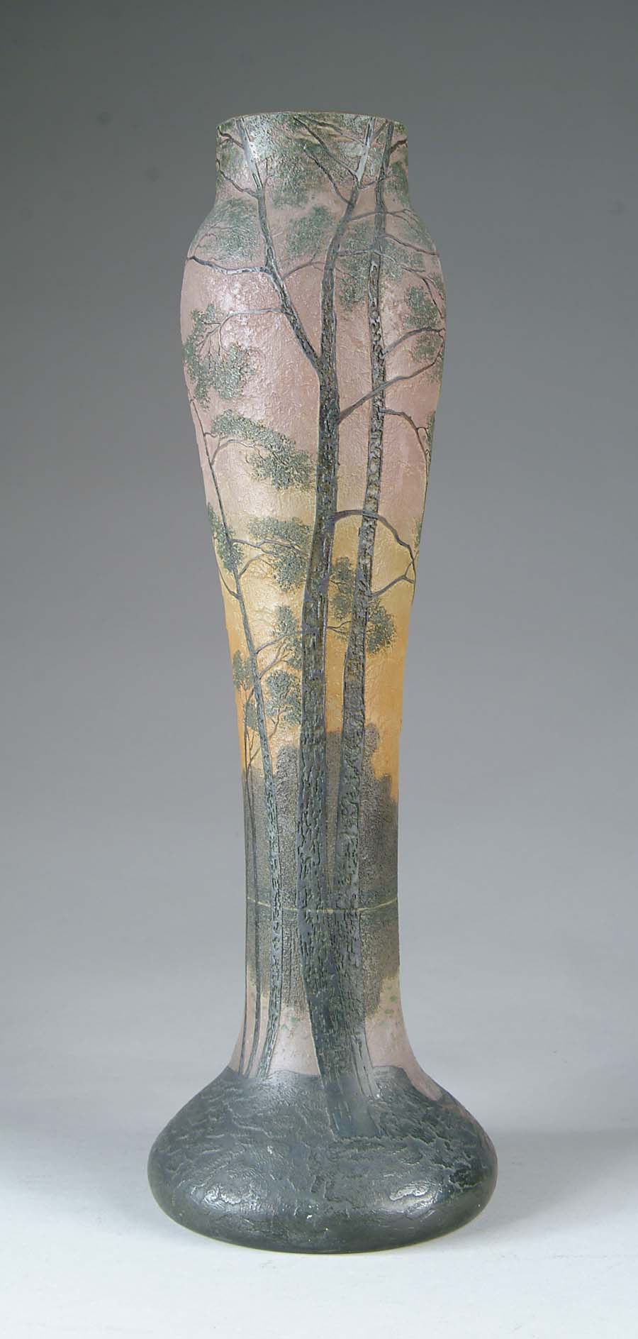 MONUMENTAL LEGRAS CAMEO VASE. Vase depicts an all over autumnal forest and lake scene with nice colors and nice depth. Signed “Legras” in cameo. SIZE: 22″ t. CONDITION: Very good to excellent. 5-71453 (1,300-1,600)