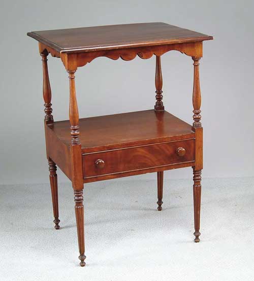 ONE DRAWER TWO TIER MAHOGANY SHERATON STAND. Bottom tier supports one dovetailed drawer. Molded edge top has original top with holes for wash set underneath. Reeded finely turned legs with scalloped front frieze. SIZE: 33-1/2” h x 23” w x 19” d. CONDITION: Very good. 9-98722 (250-400)