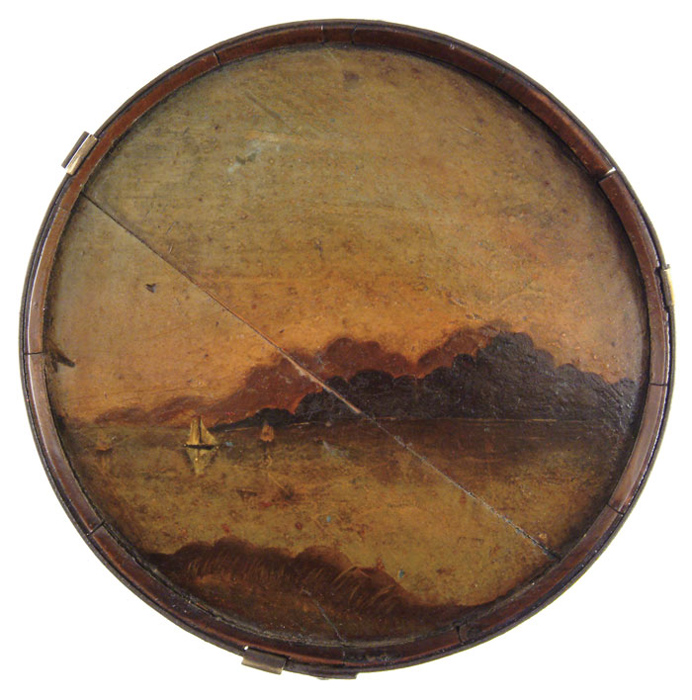 ONE OF THE FINEST CARVED AND PAINTED CAPTURED CONFEDERATE CEDAR CANTEENS EVER TO BE OFFERED. A magnificent and beautifully executed carved Confederate captured wood drum canteen documenting its surrender-with a well done folk art painting on the reverse. An historic relic of the Battle of Port Hudson and a member of the 26th Maine. The canteen is a very nice Confed. cedar wood drum canteen measuring 7 ¼” in diameter and 2 1/8” deep with iron bands and brass or copper strap guides (patina is too dark to determine the non-ferrous metal definitively). On the front face of the canteen is a truly wonderful carving-almost professional in quality as follows: In an arch at the top: SURRENDERED. Immediately below is a spread winged eagle with a banner held in its beak. The name T.H. Smith is carved below, followed by Co. B / 26th Regt ./ Me Vol /July 8th, 1863. In large fancy letters arching on each side of the central engraving is PORT HUSDON. A leafy wreath-like carving is intertwined with the inscription. On the reverse side of the canteen is a lovely and well-done oil painting of a lake and mountain scene with several small sailboats. The 26th Maine Vol. Inf. was organized at Bangor and mustered in for nine months’ service Oct. 11, 1862 serving their entire term in the Western Theater of War. They occupied of Baton Rouge, La., Dec. 1862 through March 13 and participated in operations against Port Hudson March 13-20. They moved to Donaldsonville March 28, thence to Thibodeauxville and Brashear City. Operations in Western LA April 9-May 14, Bayou Teche Campaign April 11-20, Irish Bend April 14, & Bayou Vermillion April 17. They participated in the supply train march from Alexandria to Brashear City, a march of 300 miles, May 21-26. Moved to Algiers May 27, thence to Port Hudson May 29, Siege of Port Hudson May 30-July 8, assault on Port Hudson June 14, surrender of Port Hudson July 8 & ordered home July 25 and mustered out August 17, 1863. The regiment lost 165 members during its term. This magnificent canteen was surrendered to Smith on the very day that Port Hudson fell to the Union Army. One of the nicest captured Confederate relics I’ve encountered in many years. Both carving and painting are beautifully and wonderfully executed. CONDITION: Very good. Canteen itself is tight with a lovely uncleaned patina overall. A minor age crack runs through the carved face of the canteen and there is a little dark age staining with little or no effect to its attractiveness. Reverse side, with the oil painting, also has a surface age crack simply providing a little character. 8-76154 CW18 (6,500-8,500)