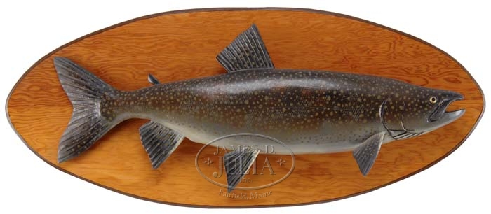 CARVED AND PAINTED LAKE TROUT BY LAWRENCE IRVINE. Unsigned. Finely carved and painted realistic lake trout mounted on an oval plywood brown painted edge stained backboard. Lawrence Irvine was a carver in Winthrop, Maine. SIZE: 30-1/2″ fish; 36″ x 15″ backboard. CONDITION: Very good. 9-73899 (2,000-2,500)