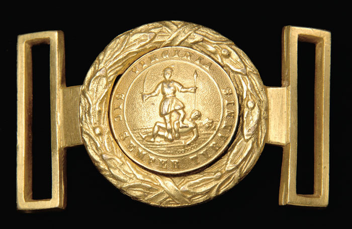 VIRGINIA 2-PC SWORDBELT PLATE. If you want the most mint Virginia 2-pc buckle of the Civil War era this is it. This buckle was orig on a salesman’s sample board. Sample board dated probably just before the Civil War. Buckle retains about 100% orig gilting and obviously was never used. This buckle shines like a new piece of jewelry. Accompanying this buckle is a letter of authenticity from noted expert Steve Mullinax who is the author of the most authoritative book on Confederate buckles. 4-59149 JS33 (6,000-9,000)