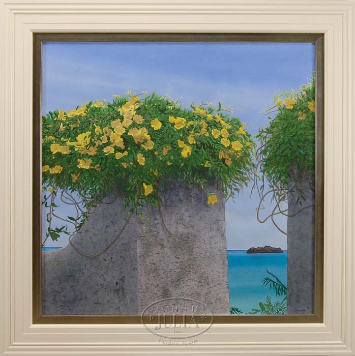 THOMAS A NEWNAM (American, 20th Century) THE YELLOW MORNING GLORIES. A large group of yellow morning glories encase the top of a stone wall with opening looking out to blue ocean with small island under a bright blue sky. Signed lower right “T. A. Newnam”. Housed in a large wide molded wood painted white frame having an inner gold liner with glass. SIGHT SIZE: 39-1/4” x 39-1/4”. CONDITION: Very good. 9-71808-2 (500-1,000)