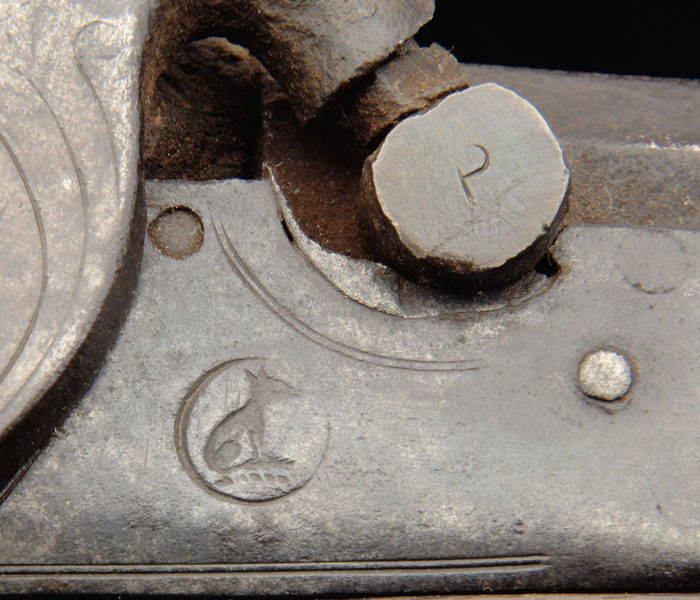 CONVERTED WHEELER INDIAN TRADE MUSKET. Cal. 62. NSN. 36-1/8” part oct bbl. Marked “WHEELER” in an upward arc vertically at rear of lockplate. The seated fox in a circle is marked in front of the hammer. London proof marks appear on left quarter flat of bbl on either side of wheel over “RW” maker’s mark. There is also a large “P” stamped on conversion drum. Sideplate, trigger guard, bbl pin escutcheons, and ramrod pipes are brass. Buttplate is iron. Sideplate is not engraved. CONDITION: Smooth brown patina with light pitting at breech. Brass has a dark patina. Stock has a repaired crack through bbl pin. Ramrod is a replacement. Mechanically good. 4-59179 FS691 (2,000-4,000)
