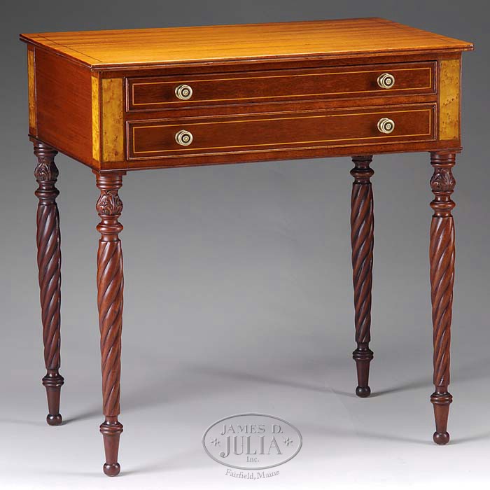 FINE SHERATON INLAID CARVED MAHOGANY TWO-DRAWER SIDE TABLE. Circa 1830, Massachusetts, North Shore. This nice example with rectangular top and molded edges above the conforming frieze fitted with two long drawers flanked by birdseye maple rectangular panels, the whole with satinwood string inlays and with cockbeaded edges, raised on acanthus carved ring turned tapering cylindrical rope twist legs with ringed cuffs and small ball feet. SIZE: 29″ h x 28″ w x 19″ d. CONDITION: Very good overall. Cleaned old surfaces. Quality replaced brasses. 9-95226 (2,000-3,000)
