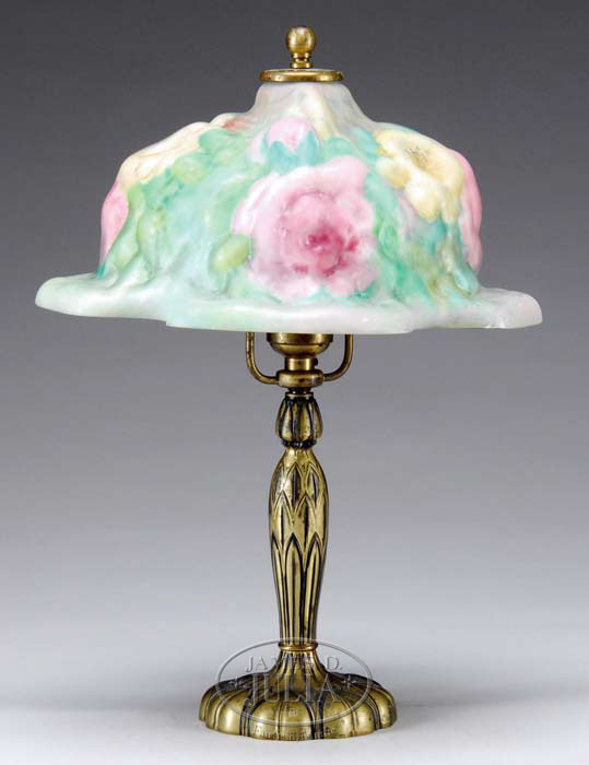 PAIRPOINT ROSE BONNET BOUDOIR LAMP Lovely Pairpoint boudoir lamp has puffy rose bonnet shade with roses painted in pastel pinks, yellows and creams against a pastel green background. The shade rests atop the original Pairpoint base with artichoke design. Base is marked “Pairpoint” as well as a “P” within a diamond and “C3084”. SIZE: Overall 14-1/2″ t. CONDITION: There is a small, tight hairline at the fitter, otherwise very good. 8-87496 (1,200-1,500)