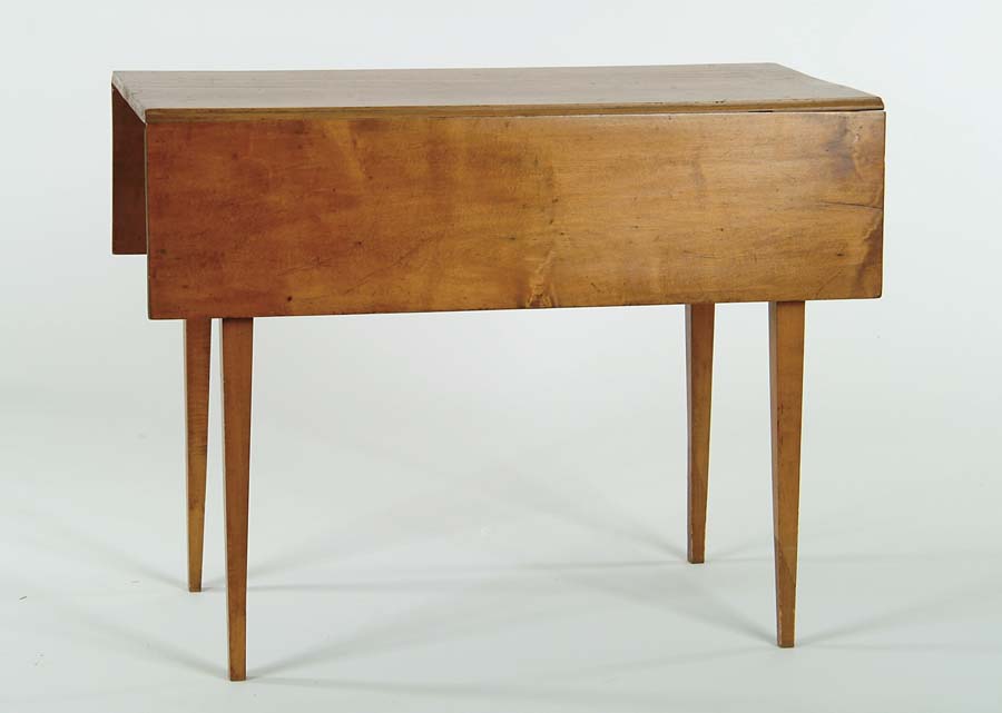 HEPPLEWHITE MAPLE DROP LEAF PEMBROKE TABLE. Drawer fitted with swirl glass knob, light brown finish. Some figuring to wood. SIZE: 28” h x 35-3/4” d x 17-1/2” w (closed); 36” w (open). CONDITION: Feet have splice ending out, otherwise good. 9-97286 (300-500
