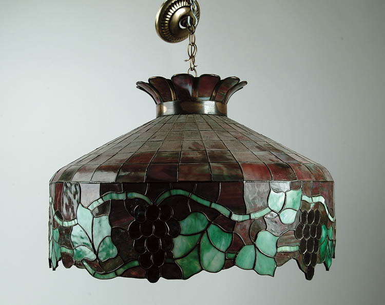 LARGE LEADED HANGING LAMP. Beautiful large hanger has 7″ border with grapes, vines and leaves. Background glass is beautiful red and green sunset glass. SIZE: 25″ diameter. CONDITION: Some cracked tiles, sockets have been replaced with modern three socket fixture and replaced modern chain and cap. 14-162 (400-600)