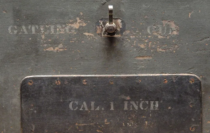 CIVIL WAR & EARLY INDIAN WAR LIMBER CHEST. What a superb piece of Civil War & early Indian War artillery! This is beautiful condition Civil War US wooden limber chest that was used to store 10-pounder Parrott ammunition for use in the field. You can still see the impressions of the shells in the bottom of the chest. When being transported, the chests were attached to the artillery limber and served as a seat for the cannoneers. Large metal handles on each end served to lift the chest and as a hand support for the cannoneers seated on the chest. The weight of an empty chest was 185 pounds; a fully-loaded chest could weigh as much as 560 pounds depending upon the type of ammunition. Limbers could hold one chest and caissons usually held two. Chests are placed on field-limbers and caissons for the transportation and safe-keeping of the ammunition. The interior compartments of the ammunition-chests vary according to the nature of the ammunition with which they are loaded. What makes this limber chest so rare and unusual is that it served two wars: the Civil War and the Indian War. Just after the Civil War ended a small number of 1-inch Gatling Guns were manufactured for the Indian War. General George Armstrong Custer had three 1-inch Gatling Guns and limbers. Unfortunately he left them behind right before the Battle of Little Bighorn. Could this be one of Custer’s limber chests? SIZE: 44-1/2” long x 22-1/2” deep x 17” high (excluding handles). CONDITION: This chest is all orig and solid and sound: wood surfaces are scratched and dinged, but most of the orig paint is still present. Copper top exhibits a great uncleaned dark brown patina with a contemporary riveted patch that has patinated to match. Orig paint on the wood and metal is present though worn. Of all of the limber chests I have encountered over the years this one is as nice or nicer than all of the rest, the surface is so untouched inside and out. Not only does it have superb condition but it has a superb story that spans two eras of American history. 4-60670 JS42 (8,000-12,000) unreserved!