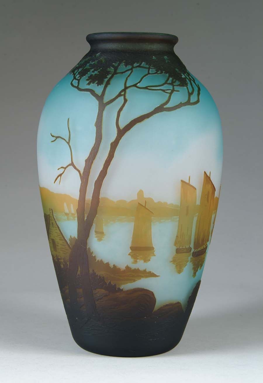 MULLER FRES LUNEVILLE NAUTICAL SCENE VASE. Large classic form bulbous vase begins with a sky blue background decorated with a scene of ships in a harbor with a cottage and trees in the foreground. A very pretty vase. Signed “Muller Fres Luneville” in cameo. SIZE: 13” t. CONDITION: Very good to excellent. 5-71174 (2,500-3,500)