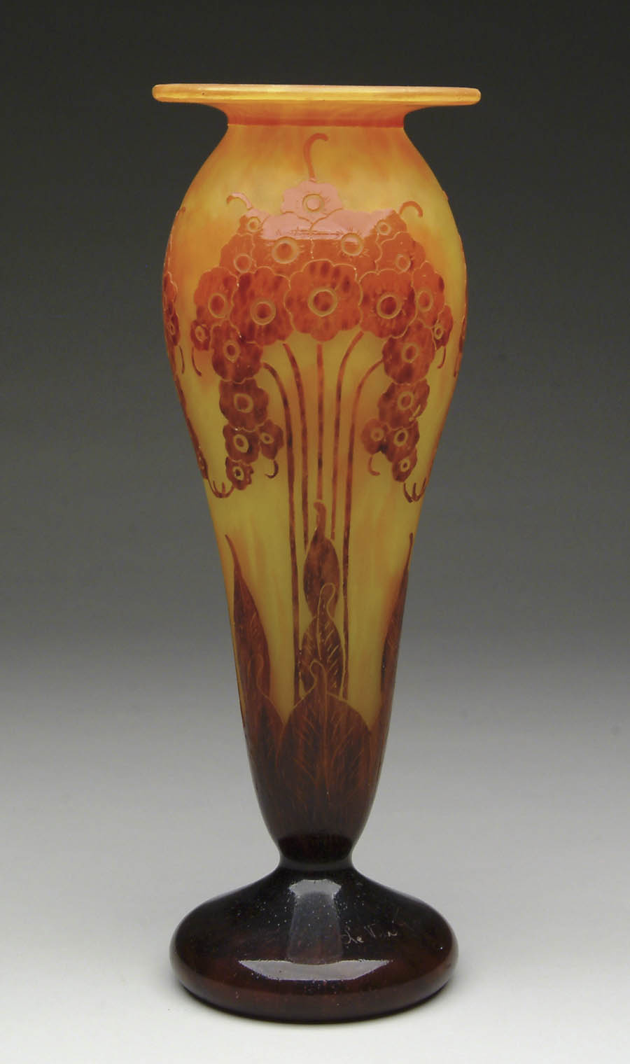LE VERRE FRENCH CAMEO VASE. This wonderful Le Verre footed vase is decorated in the beautiful patura pattern. The colors are a fiery orange receding into raisin against a bright yellow and orange mottled background. Signed “Le Verre Francais” in script. SIZE: 15-3/4” t. CONDITION: Open bubble to interior rim, otherwise very good. 5-61734 (2,000-3,000)