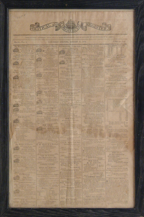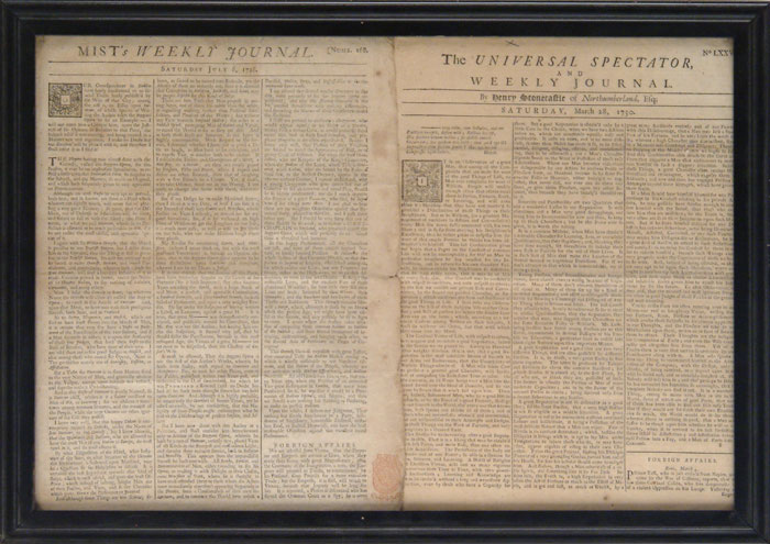 LOT OF 6 FRAMED NEWSPAPER PAGES. 1) The Courier dated 22 April 1815 London. 2) National Intelligencer Washington 1812. 3) Political and Commercial Register Philadelphia 1804. 4) The Universal Spectator North Umberland 1730. 5) Aberdeen Journal 1791 6) Poulson’s American Daily Advertiser Philadelphia 1812. The first five in matching13-3/4” X 20-1/8” frames. The last in 14-1/2” X 22” frame. CONDITION: All with folds and toning, but some very interesting reading. Wm. Hancock Collection 4-58646 FS796 (300-500)