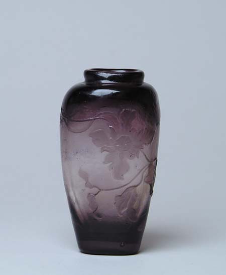 GALLE WHEELCARVED VASE. Lovely Galle vase has wheelcarved flowers and leaves against a background glass of clear shading to amethyst. Flowers have nicely detailed wheelcarving. Signed on bottom “Cristallerie Galle Nancy”. SIZE: 6″ t. CONDITION: Very good to excellent. 5-68946 (3,200-3,600)