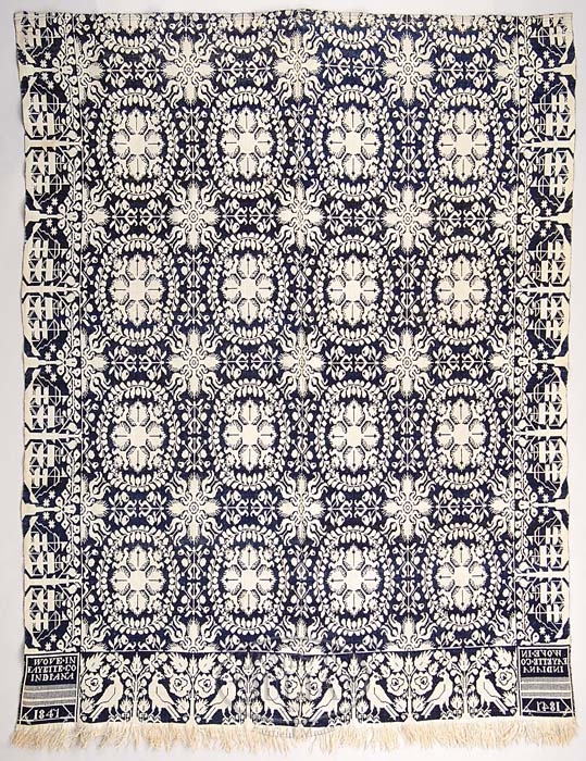 JACQUARD COVERLET, FAYETTE COUNTY, INDIANA. Circa 1841. The double lily and medallion form coverlet with cutters, oak tree and quail border, two corner panels signed “Woven in Fayette Co Indiana 1841″. SIZE: 7’1″ x 5’9”. CONDITION: Very nice overall with minimal discoloration to fringe and outer edges. 9-92106 (300-500)