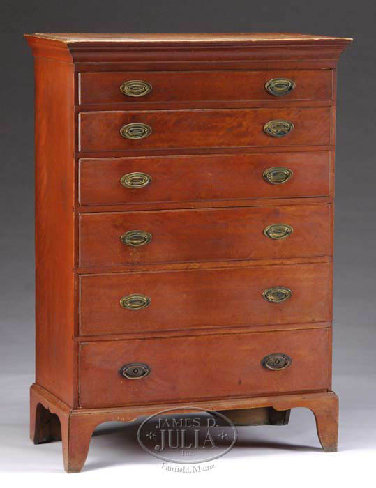 MAINE FEDERAL HARDWOOD TALL CHEST IN ORIGINAL RED WASH. Cornice molded top, dovetailed case fitted with six graduated drawers having most of its original brass hardware (bottom drawer with two replacements). Set on its original tall bracket base. Each drawer having thumb molded edge. Circa 1800. SIZE: 55-1/2” h x 36” w x 19” d. CONDITION: Generally very good with only minor lip repair. 9-73602 (4,000-6,000)