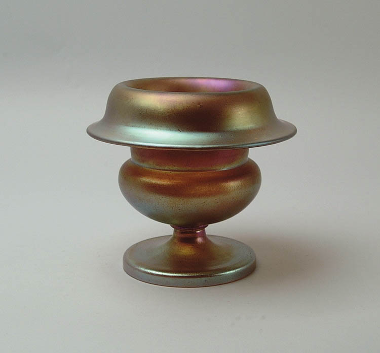 CZECHOSLOVAKIAN IRIDESCENT GOLD VASE. Iridescent gold finish with purple highlights, fold over top and applied pedestal foot. Signed on base. SIZE: 7 1/2″ tall by 8″ diameter. CONDITION: Very good to excellent. 5-67236 (200-400)