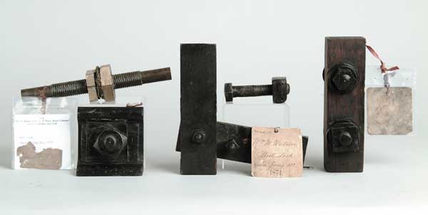 PATENT MODEL: GROUPING OF FIVE 1) Wm. M. Watson, Nut Lock. Original patent tag, no. 146416, patented January 13, 1874. Wooden model. SIZE: 8″. CONDITION: Good. 2) E. R. Shepard, Nut Lock. Original patent tag, no. 191079, patented May 22, 1877. Wooden model with two large bolts through it. SIZE: 8″. CONDITION: Good. 3) Nut Lock. Iron threaded rod with two large brass nuts. SIZE: 10″. CONDITION: Good. 4) Nut Lock. Partial original tag, patented 1872. A wooden block with a bolt through it. SIZE: 4″ square. CONDITION: Good. 5) Nut lock. Size: 4”. CONDITION: Good. 1-488, 1-29804 (400-700) Auction: Advertising, Toy & Doll - Spring 2003 Please Note: All prices include the hammer price plus the buyer’s premium, which is paid by the buyer as part of the purchase price. The prices noted here after the auction are considered unofficial and do not become official until after the 46th day. |