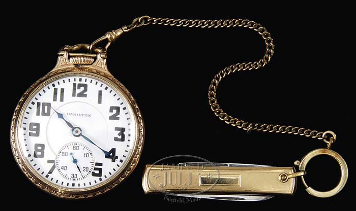 HAMILTON POCKET WATCH. Nice Hamilton twenty-one jewel pocket watch has double roller movement adjusted to five positions. Serial number on the movement is 2436328, which would show the movement being produced in 1930. Movement is housed in a Wadsworth 10-carat gold-filled case with plain back and impressed loop decoration around the edge. The white face has black Arabic numerals and gun metal hands with an inset second hand. The watch is finished with a short gold-filled chain with a gold-filled gentleman’s pocketknife at the end. SIZE: Watch 2″ dia. CONDITION: Very good to excellent. 5-67474 (100-200)
