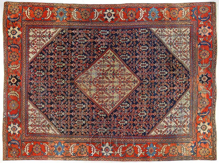 NICE MAHAL ORIENTAL CARPET, CENTRAL PERSIA. 1st quarter 20th century. Having a central serrated diamond medallion in ivory, with green and brick red borders set within a blue-black field with rows of dense polychrome poled latticework within ivory spandrels, the brick red main border with large pomegranate and saz leaf trelliswork. SIZE: 12″‘ x 8’8″. CONDITION: With overall wear throughout and with color wash. Foundation intact, as are ends and selvages. 9-95080 (2,000-3,500)