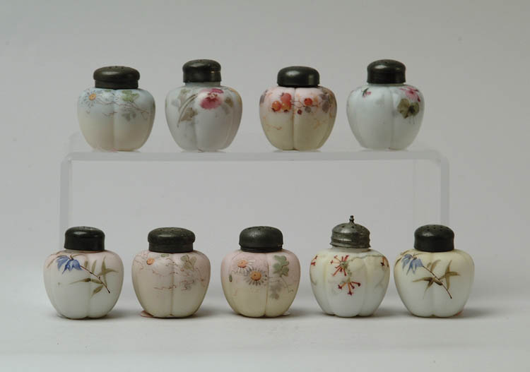 LOT OF NINE MT. WASHINGTON SALT SHAKERS. All shakers are melon-ribbed with various decorations of berries, flowers and leaves. SIZE: Approx. 2″ tall. CONDITION: Five of the nine have a replacement metal cover, otherwise very good to excellent. 5-67348-195 (300-500)