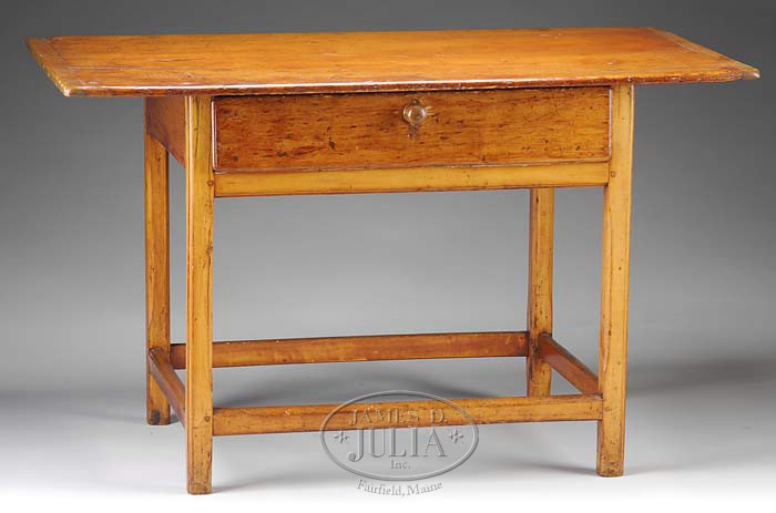 AMERICAN CHIPPENDALE PINE TAVERN TABLE. Last half 18th century. The rectangular top with breadboard ends projecting above the conforming frieze with molded edges fitted with a single long drawer, raised on square molded and chamfered legs joined by a molded rectangular box stretcher. SIZE: 27″ h. x 44-1/2″ l. x 24-1/2″ d. PROVENANCE: From an East Sangerville, Maine private collection. Acquired from Robert Hall, Dover-Foxcroft, Maine in the 1950’s by the present owner’s parents. CONDITION: Table is structurally very good. Mortised, tenoned, and pinned construction. Top and apron with some early professional restoration. Refinished in honey color showing traces of original red wash. 9-94675 (800-1,200)