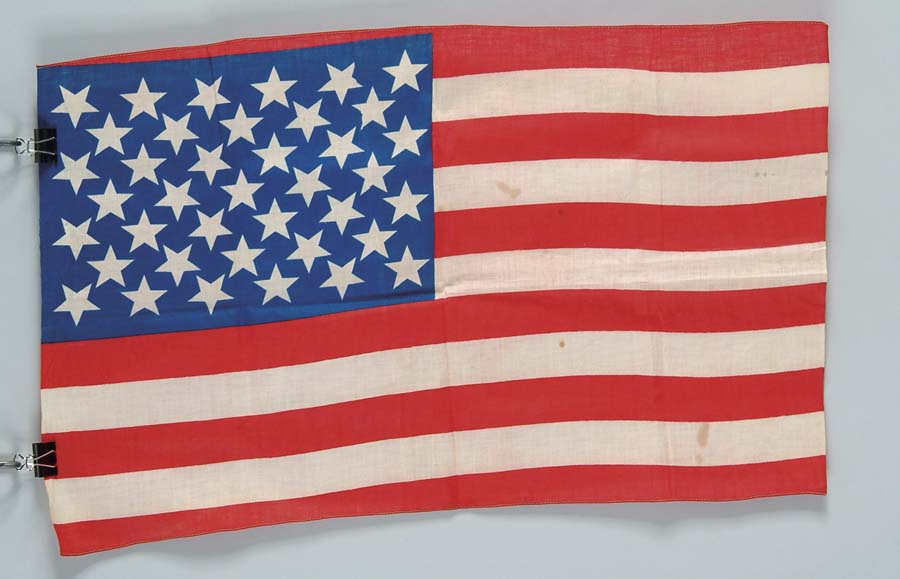 39-STAR AMERICAN FLAG. 18” x 30” flag is printed on cotton & canton sits on red stripe. 39 stars is a rare configuration & is a rare unofficial flag commemorating the state of North Dakota, Nov. 1889. CONDITION: Fine bold colors. Flag apparently unused. 4-54077 JS109 (500-1,000)