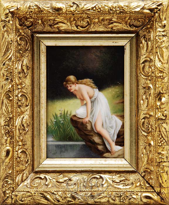 FRAMED PORCELAIN PLAQUE. Beautiful porcelain plaque depicts a partially nude maiden sitting on a rock looking down into a pond or lake. The plaque is framed in a beautiful ornate gesso and wood frame with gilded finish. Plaque is marked on the back “107”. SIZE: Plaque 5-3/4″ x 4″. Overall 7-3/4″ x 9-1/2″. CONDITION: Very good to excellent. 5-66841 (1,300-1,500)