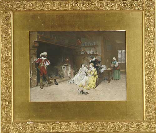AFTER ADRIEN MOREAU (French, 1843-1906) LE REPOS A LA FERME”. Colored print published by M. Knoedler. Dated 1876. Title and publishing information is hidden under gold matte. Colorful interior scene shows two women in fancy dress being tended to by two Cavaliers. Housed in its original flower decorated gesso gilt frame with wide gilt matte. SIZE: 21” x 25-1/2”. SIGHT SIZE: 13-3/4” x 19”. CONDITION: Good. 9-97197 (150-250)