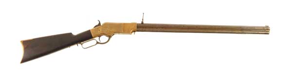 TEXAS PRESENTATION HENRY MODEL 1860 LEVER ACTION RIFLE. Cal. 44RF Henry. Standard Henry rifle with 24” oct bbl and integral magazine tube. It has a replacement silver blade front sight and 900 yard ladder rear sight. The stock is nicely figured, dark, oil stained walnut. The receiver is period engraved with the inscription on the left sideplate “J. Jack Wimberly/Capt. 5th Texas Calv” (sic). The right sideplate is inscribed with a five-pointed star with the letters for “Texas” in each of the points, with “5th” in the center. The rest of the receiver and sideplates have about 40% coverage arabesque patterns with punch dot background. Left side of bbl and butt stock are fitted with original sling loops. It is accompanied by excerpts from a diary reportedly maintained by a member of Terry’s Rangers, who was hanged as a spy. He reportedly had been a member of Co D and was captured with the diary in his pocket, which was used as evidence to convict him. One of the entries dated Sunday the 8th (year not indicated) mentions that Dodd and someone else named Jim “came on to Captain Wimberlys staid (sic) all night”. SN 1979. CONDITION: Very good to fine. Bbl retains no original finish being a clean gray metal color with some light rust spotting. The stock appears to be a replacement as it is un-numbered and the buttplate is numbered to another rifle. It is sound and retains most of an old refinish. Bbl and lever have the appearance of metal which has gone through a fire, which would explain the replaced stock. The bolt is heavily rusted. The receiver and buttplate have been cleaned in the past and are now beginning to patinate. The magazine spring appears to be a replacement. Strong dark bore with moderate pitting. 4-49207 JR30 (25,000-35,000)