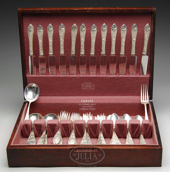 60 PIECE CASED STERLING FLATWARE SET BY SCHOFIELD CO. IN THE “LORRAINE” PATTERN. Set consists of twelve 9″ knives, twelve 7″ forks, twelve 6-1/4″ salad forks, twelve 6″ teaspoons and twelve 6-3/4″ soup spoons. Having two different monograms with allover chased floral decoration on the front side. Housed in hinged mahogany lined box. Weight: 63 troy oz. (weighable silver). CONDITION: Very good. Box shows wear. 5-68006 (1,200-1,800)