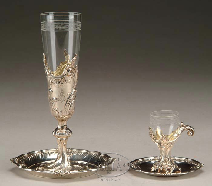 CASED GERMAN SILVER & GLASS CORDIALS & CHAMPAGNES BY J.H. WERNER, BERLIN. Set consist of twenty-four 7-1/4” h silver and glass champagne flutes. Each having a 5” dia under tray and twenty-four 2-3/4” h silver and glass cordials each having a 3-1/2” under tray. Champagnes and under trays monogrammed with an “AS”. The clear glass inserts having an etched upper rim. All fitted in a custom mahogany velvet and leather lined case having five removable trays. The large case has a hinged top and side brass handles. Each silver piece marked “J.H. Werner, Berlin 800”. Late 19th Century. SIZE: Case is 7” h x 34-1/2” w x 24” d. PROVENANCE: The Lily & Edmund J. Safra Collection, Sotheby’s Sale No. 8124, Lot 557. CONDITION: Very good. 9-71149 (20,000-25,000)