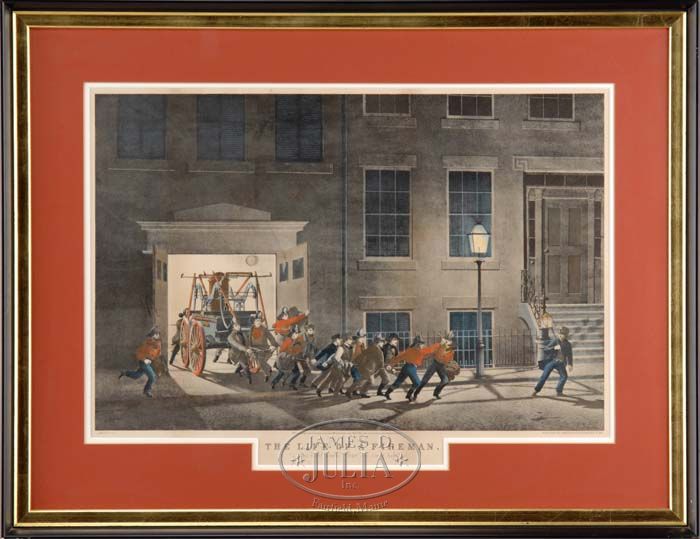 CURRIER & IVES (American, Publisher, 19th Century) “THE LIFE OF A FIREMAN-THE NIGHT ALARM-START HER LIVELY BOYS”. Fabulous colored lithograph shows fifteen fireman bringing an engine on cart out of a fire house. It is nighttime and the scene is lit by streetlights and a man with a lantern. After a painting by “L. Maurer” and dated “1854”. A nice large folio with good color. Housed in a modern black and gilt molded wood frame with red and white mattes which have cutout for a title. IMAGE SIZE: 17-1/4” x 26”. SIGHT SIZE: 19-1/4” (to bottom of cutout) x 26-1/2”. CONDITION: Very good, not examined out of frame. 9-90420 LG (4,000-5,000)