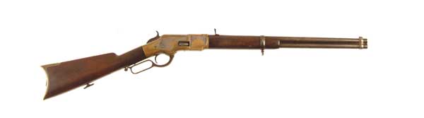 EARLY WINCHESTER MODEL 1866 LEVER-ACTION CARBINE. Cal. 44 RF Henry. Standard carbine with 20” round bbl, full magazine, bbl band with fixed integral front sight. Full buckhorn rear sight. The top of bbl has “Henry’s” and “King’s” patent markings. It had a plated receiver and uncheckered wood with straight stock and crescent buttplate. Contemporary additions include sling loops added to bbl band and stock, a staple and ring in the left side of the receiver. The trap contains a 3-piece iron and brass wiping rod. The serial number is found under the wood on the left side of the lower tang and again inside the toe of the buttplate. The stock does not have the serial number in the upper tang channel. It appears that a recent minor modification has been made inside the channel, which removed the serial number. Looking at the carbine, it is conceivable that this is the original stock and has been on this gun a very long time. From the James D. Gordon collection, the gun is pictured on pg. 58 of The Winchester Book by Madis. SN 15176. CONDITION: Good to very good. Traces of original finish remain on bbl and magazine tube and the two bbl bands with the remainder a silver-brown patina with scattered light surface rust spotting. The front sight has been modified. The lever and hammer dark brown patina with light surface pitting. The receiver, with modestly worn edges, retains 50-60% thin original plating. It has a few hammer marks on top of the left sideplate. The forearm has a hairline crack and the butt stock a couple of grain checks and retains a fine, old hand-rubbed patina, possibly a very old refinish. Strong dark bore. 4-50082 (8,000-12,000)