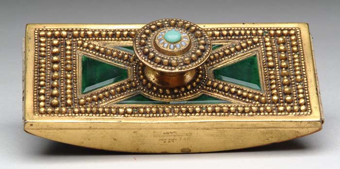 TIFFANY STUDIOS ROCKER BLOTTER. In the Byzantine pattern with emerald green inserts and turquoise jewel top surrounded by white opalescent mini jewels. Signed on the side “Tiffany Studios New York 987” together with a scratched in and crossed-out “6780” and scratched in “350”. CONDITION: Minimal wear to gilding, one tiny chip to one corner of one green insert. 5-63793 (1,500-2,000)