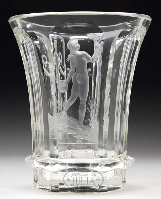 JOSEF DRAHONOVSKY INTAGLIO VASE. Extremely fine Drahonovsky vase features six fluted side panels, three of which are intaglio carved with standing nudes. Intaglio carving is beautifully done with fine detail. Vase is signed beneath one carved panel “J. Drahonovsky Praha”. SIZE: 9″ t. CONDITION: Very good to excellent. 5-67500 (2,500-3,500)
