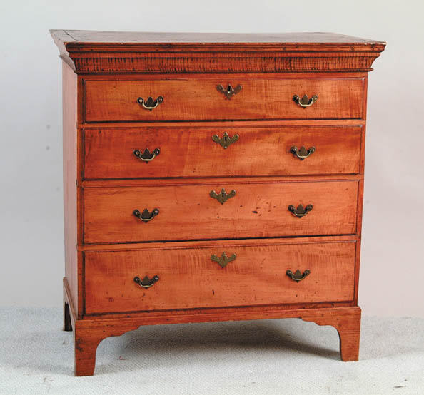 GRADUATED FOUR DRAWER TIGER MAPLE CHEST. This piece has been converted from a highboy to a chest a long time ago. It has an applied bracket foot with good tiger maple cornice molding. Nice honey brown patina and good bale brasses. SIZE: 35” w case size x 18-1/2” d x 40-1/2” h. CONDITION: Very good. 9-95174 (800-1,200)