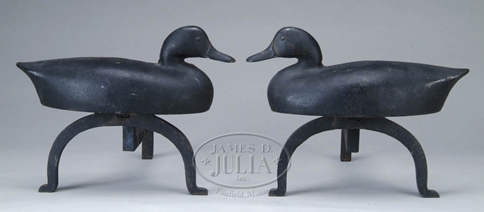 PAIR OF DUCK CAST IRON ANDIRONS BY LIBERTY FOUNDRY, ST. LOUIS, MO. Mid 20th Century andirons in the shape of a duck. SIZE: 11” h x 14-1/2” w. CONDITION: Very good. 9-29314 (300-500)