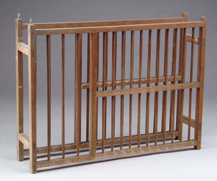 HANGING PINE PLATE RACK. Wood pegged mortise and tenon construction having two size plate holders. SIZE: 29-1/4” h x 39” w. CONDITION: Very good. 9-72440 (200-400)