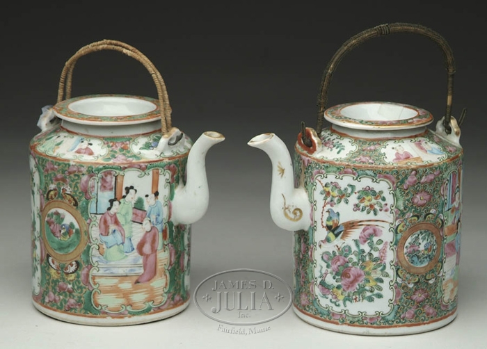 TWO ROSE MEDALLION TEAPOTS. 19th Century. Drum form, complete with covers. PROVENANCE: Estate of Maria M. Viveiros, New Bedford, Massachusetts. SIZE: 6-1/2” h x 5” dia of body. CONDITION: Generally very good. One has slight nick on spout. 9-28786 (300-500)
