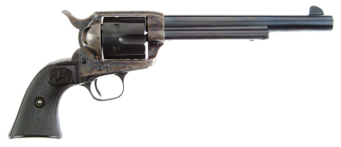 *COLT PRE-WAR SINGLE ACTION ARMY REVOLVER. Cal. 45 Colt. SN 350730. Blue & case colored with 7-1/2” bbl and Rampant Colt hard rubber grips. Serial number is scratched inside each grip and is also found on right side of front & back straps under grip. Last two digits of serial number are on back of cylinder. Accompanied by its orig hinged lid, dark maroon, cardboard box with blue & white end label and serial number faintly in pencil on bottom. CONDITION: Very fine to extremely fine, all matching. Bbl & ejector rod housing retain about 95% glossy orig factory blue and frame & hammer, most of their orig case colors, brilliant in sheltered areas, faded elsewhere, thin on top strap. Cylinder retains virtually all of its orig factory blue. Grip frame retains about all of orig factory blue with some light wear on heel and a couple of nicks on backstrap. Grips are extremely fine showing very slight diamond point wear. Mechanics are crisp, bright shiny bore. Box is fine with two pieces of label end missing with a broken bottom front seam and broken top rear seam. 4-58715 (10,000-12,000)