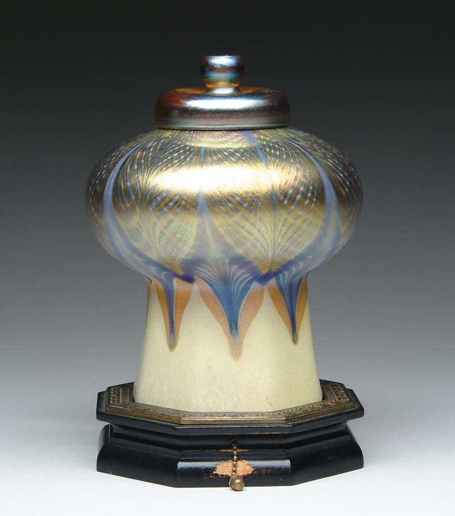TIFFANY MOSQUE LAMP. Outstanding Tiffany mosque lamp features decorated shade with gold iridescent pulled feather design separated by a blue and white pulled feather design which is inturn outlined with gold iridescent trim. All set against a creamy yellow background. Shade is topped with a gold favrile heat cap with vent hole in center of finial. Shade rests on original wooden stand with cast bronze trim. Shade is signed on fitter “LCT”. Heat cap is signed on the underside “LCT Favrile”. SIZE: 8-1/4 in. t. CONDITION: Some minor wear to wooden base caused by pull chain, two screws are missing from bronze trim and small flake to fitter rim of shade. Estate of Jon Heiden & Donald Mooers 5-60671 (2,500-3,500)
