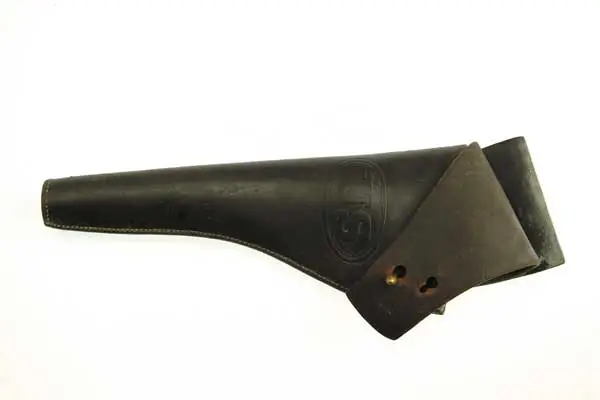 U.S. COMBINATION HOLSTER FOR COLT SINGLE ACTION OR SCHOFIELD REVOLVERS. Marked “.ANZ, OWEN, & CO.” in an arc over “CHICAGO”. Inspector marks “H.K” are on the end of the flap. CONDITION: Very good with considerable wear at the tie down holes, light mildew staining on the belt loop and verdigris on the rivets. 4-49535 FS308 (250-500)