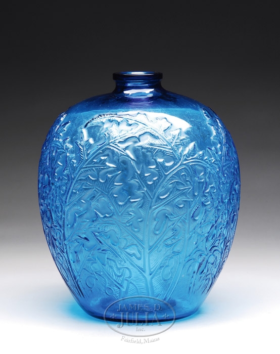 R. LALIQUE ACANTHES VASE. Very pretty Lalique vase is done in rich blue glass impressed with acanthus leaves surrounding the body of the vase. Signed on the underside with engraved script “R. Lalique France”. SIZE: 11″ h. CONDITION: Very good to excellent. 5-67720 (15,000-18,000)