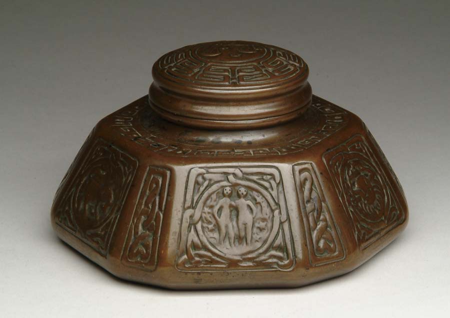 TIFFANY ZODIAC INKWELL. Wonderful Tiffany bronze inkwell has zodiac figures in medallions surrounding the inkwell as well as the middle of the hinged top. Complete with original clear glass insert. Signed on the underside “Tiffany Studios New York 1072”. SIZE: 6-1/4 in. across. CONDITION: Very good to excellent. 5-61491 (1,300-1,600)